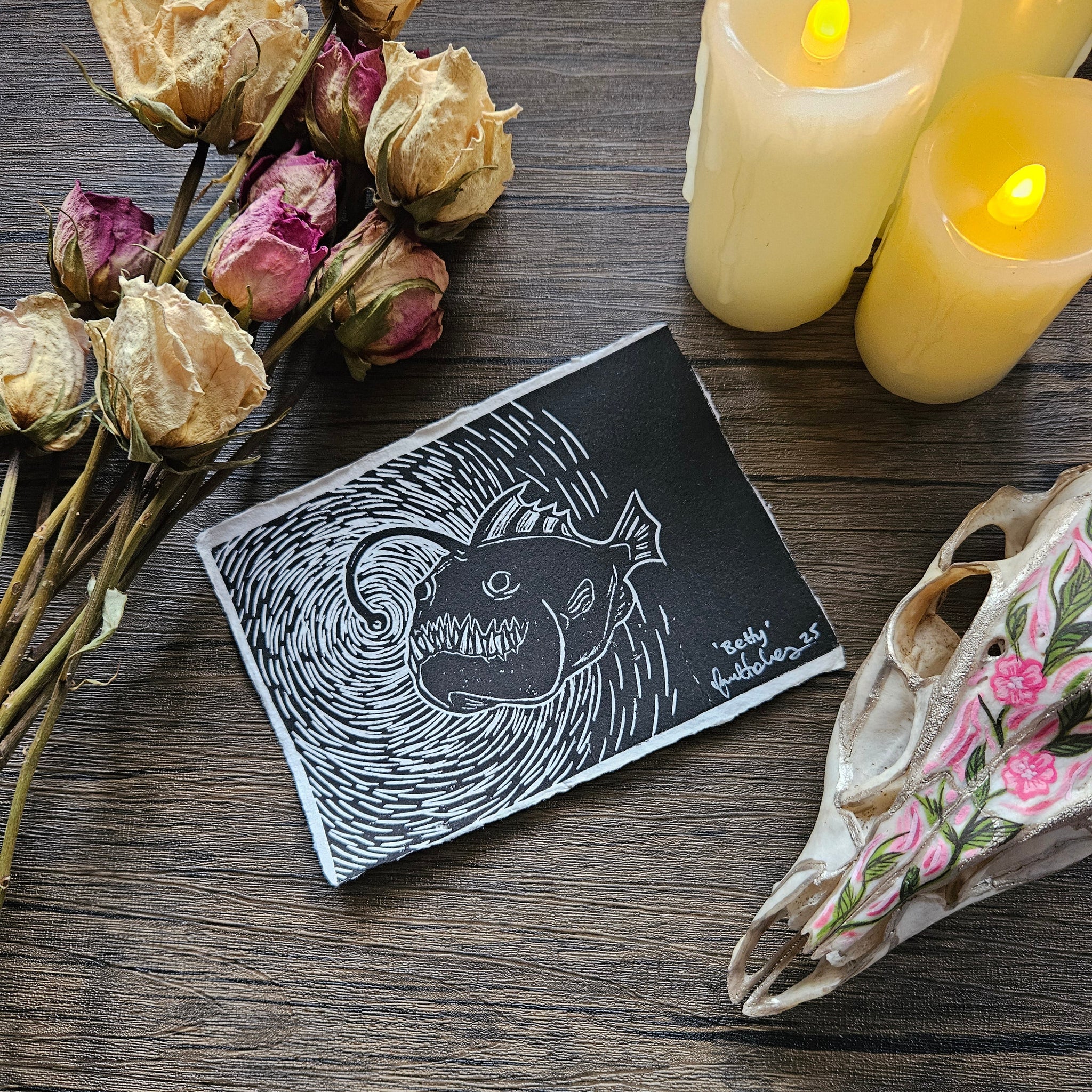 Betty the Angler fish A6 lino print